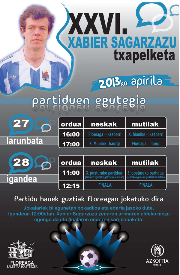 Datorren asteburuan, apirilaren 27 eta 28an jokatuko da XXVI. Xabier Sagarzazu Txapelketa Floreaga Ikastetxean.