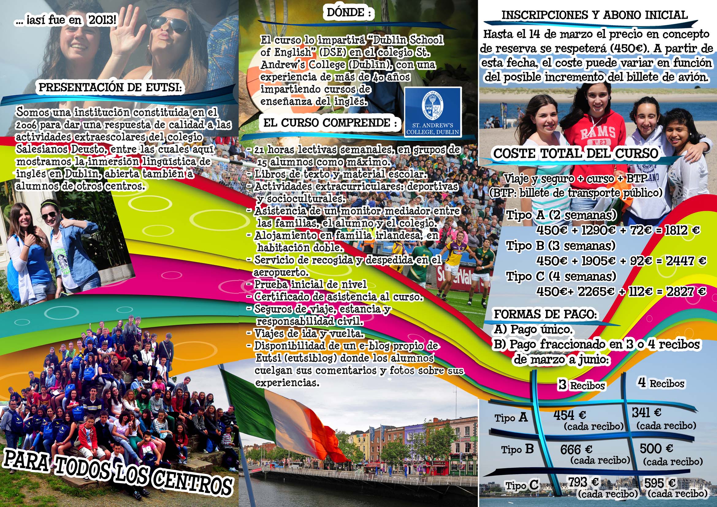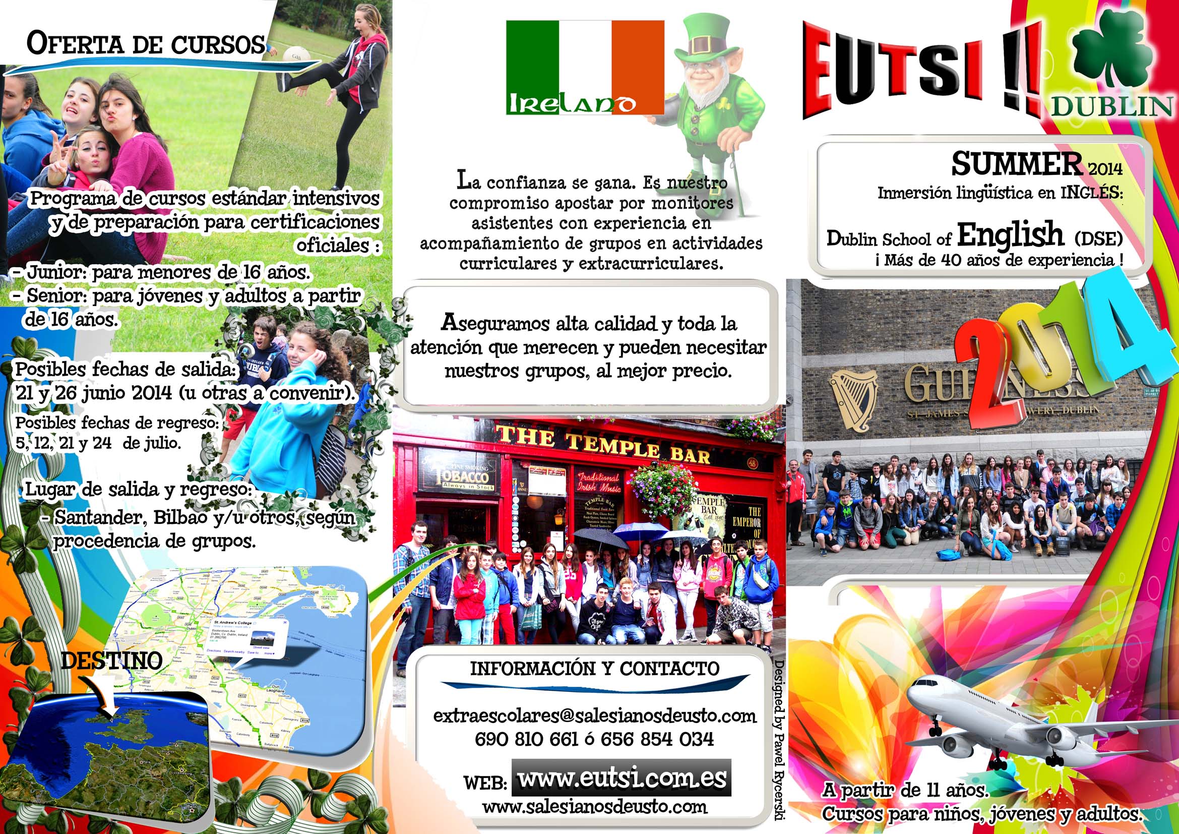Eutsik Deustuko salestar ikastetxeko eskolaz kanpoko ekintzak antolatzen ditu eta urtero hizkuntzako murgiltze-programa bat antolatzen du Irlandan, ingelesa hobetzeko asmoz. Klaseak Dublineko “St. Andrew’s College”-ko “School of English”-en ematen dira. Egonaldiak bi, hiru edo lau astekoak izan daitezke. Bertan Bigarren Hezkuntzako ikasleek (12-16 urte bitartekoek) parte har dezakete. Honi buruz zehaztasun gehiago jakiteko triptikora jo dezakezu. Hala ere, informazio gehiago nahi izanez gero, eskolako idazkaritzan galde dezakezue.