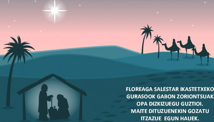 “ELKARREKIN” GURASO ELKARTEA 2015-12-24 Idazlea: Zezilio Leave a Comment FLOREAGA Salestar Ikastetxeko GURASOOK Gabon zoriontsuak opa dizkizuegu guztioi. Maite dituzuenekin gozatu itzazue egun hauek.