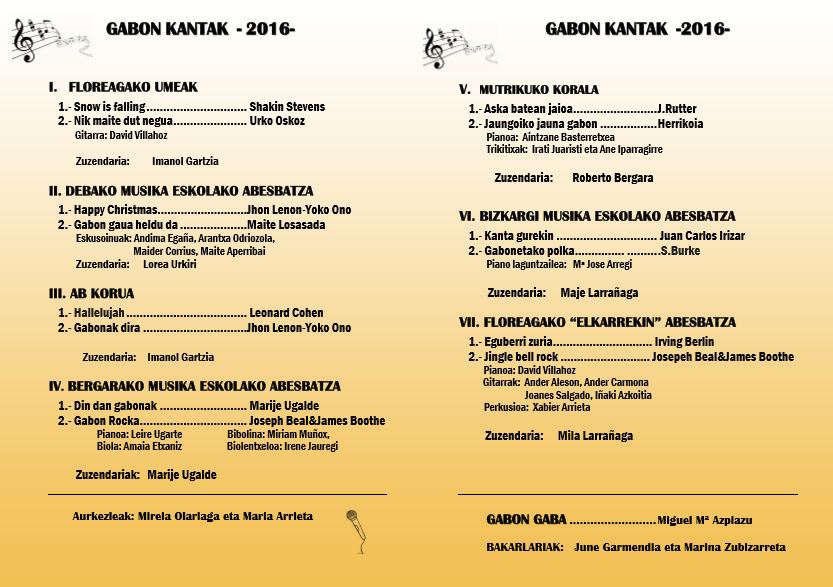 Bertan zazpi abesbatza izango ditugu: Floreagako haurrak, Debako musika eskolako abesbatza, AB korua, Bergarako musika eskolako abesbatza, Mutrikuko korala, Bizkargi musika eskolako abesbatza eta Floreagako “Elkarrekin” abesbatza.