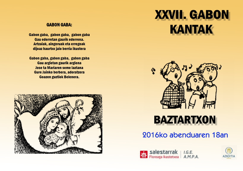 Azken hogeita sei urteetan bezala, igande honetan Floreaga Ikastetxeko “ELKARREKIN” guraso elkarteak antolatzen duen GABON KANTAK saioa ospatuko da.