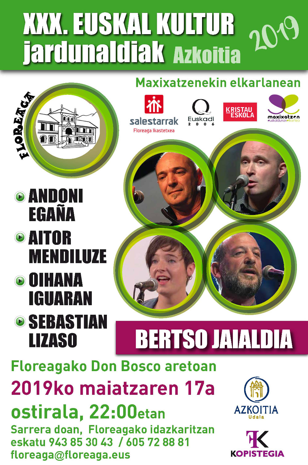 XXX. Kultur Jardunaldien barruan, Bertso jaialdi berezi bat antolatu da Andoni Egaña, Aitor Mendiluze, Oihana Iguaran eta Sebastian Lizasorekin. Aurten Maxixatzenekin elkarlanean antolatu da. Hau izango da aurtengo 2. saioa.