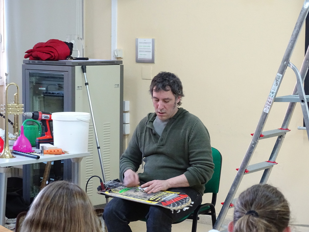 Gaur, abenduak 18, Trakamatraka ikuskizuneko kide den Jonen bisita jaso dugu DBH 2ko ikasleok. Jon, musikaria da baina berezi xamarra: ia edozein materialekin musika instrumentuak sortzeko gai da. Asmakuntza ugari erakutsi dizkigu, guztien oinarria berrerabilitako material edo objektuak izan direlarik: patinete batekin egindako gitarra, hodi eta ureztaontziarekin egindako tronpeta, azenario txirula, etab. Guztiak itxuraz eta soinuz, benetako instrumentuen oso antzekoak!