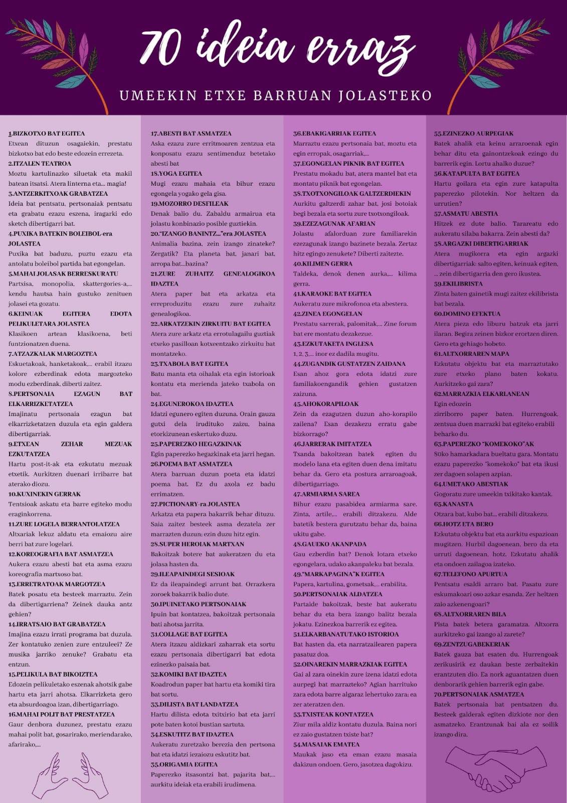 Goiko taulan ongi ikusi ezin badituzue, hementxe dituzue etxetik irten gabe umeekin egiteko 70 aukera ezberdinen zerrenda: