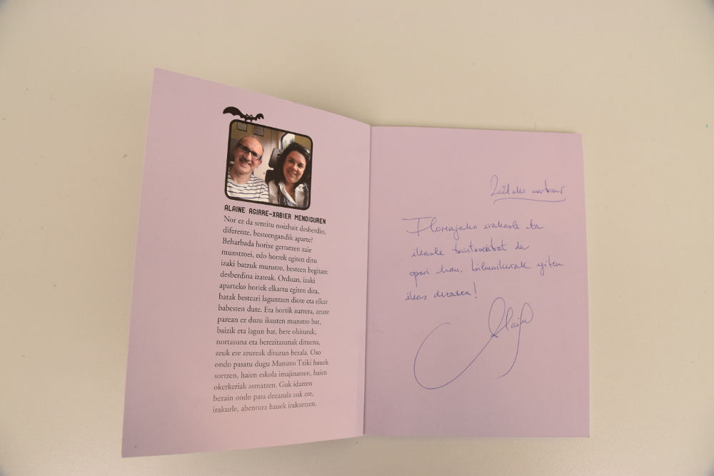 “Galdera guztiak erantzun ditu eta ipuin bat idaztera animatu gaitu. Ipuinak idazten nola eta noiz hasi zen ere esan digu. Gero liburuak sinatu eta berak idatzitako liburu bat oparitu digu eskolako liburutegirako. Oso gustura egon gara”.