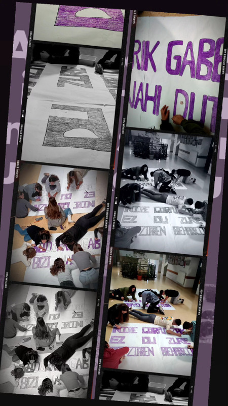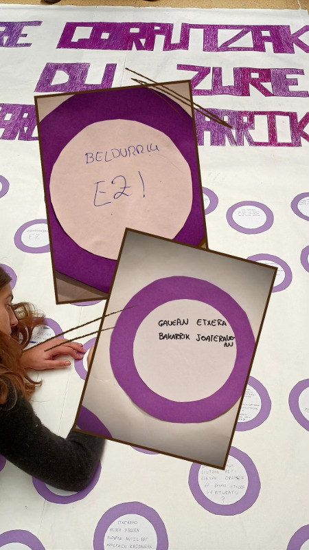 DBH4-ko ikasleek, kartel handi batzuk egin dituzte, honako esaldi hauekin: “Beldurrik gabe bizi nahi dut” eta “ Nire gorputzak ez du zure iritziaren beharrik”. Gero, DBH-ko neskek beraien esperientziak borobil batzuetan idatzi eta behar itsatsi dituzte.